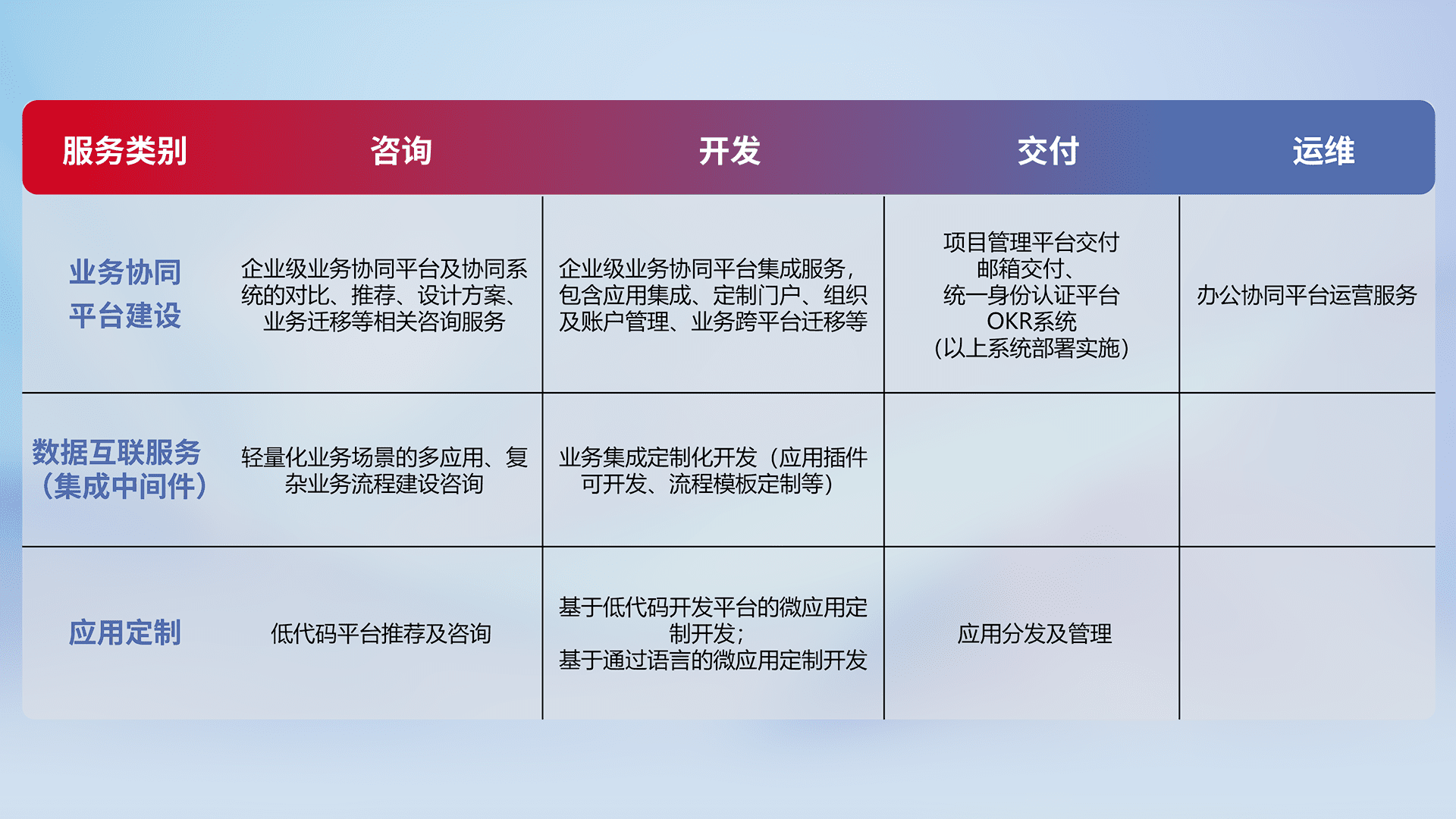 针对钉钉、、企微、、IDaas等平台级产品提供产品的规划、、、、方案、、交付、、定制化开发等服务,,实现如统一协同办公、、智能客户服务、、混合会议管理、、、、智能数据查询、、、、等业务场景,,实现数字化转型。。